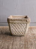 イギリスの古セメント製のプランター(植木鉢) です。色褪せた風合いが良い雰囲気です。所々欠けが有りますが、 大きなダメージ無くコンディション良好です。 斑入りのギボウシのような植物が似合いそうです。 コケのような色は枯れて風合いが変わるかもしれません。