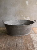 イギリスの蚤の市で見つけてきた古い ブリキ製のウォッシングタブです。 少し大きいサイズです。使い込まれた風合いがとても素敵です。 風化したブリキの質感がとても素敵です。 壁に吊り下げたり、土を混ぜたり、と色々と使い道がありそうです。 ガーデンインテリアのアクセントにオススメです。 お花屋さんや雑貨屋さん等ショップディスプレイにもオススメです。所々ゆがみはあります。(画像参照) 大きなダメージ無くコンディション良好です。