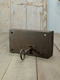 イギリスの蚤の市で見つけてきた古い 鉄製の錠前です。 使い込まれた風合いがとても素敵です。 鍵、錠前共に大きなサイズで存在感あります。 施錠、開錠をするとき、鍵を2.3回転ぐらいさせて、段階的に棒が出たり引っ込んだりします。大きなダメージ無くコンディション良好です。 寸法 幅19cm 高さ10.5cm 奥行き4cm(5.7センチ) 年代1920~1930年代 アンティークの為お客様との見解の相違が多少あるかと思いますが ご理解の上、ご購入よろしくお願い致します